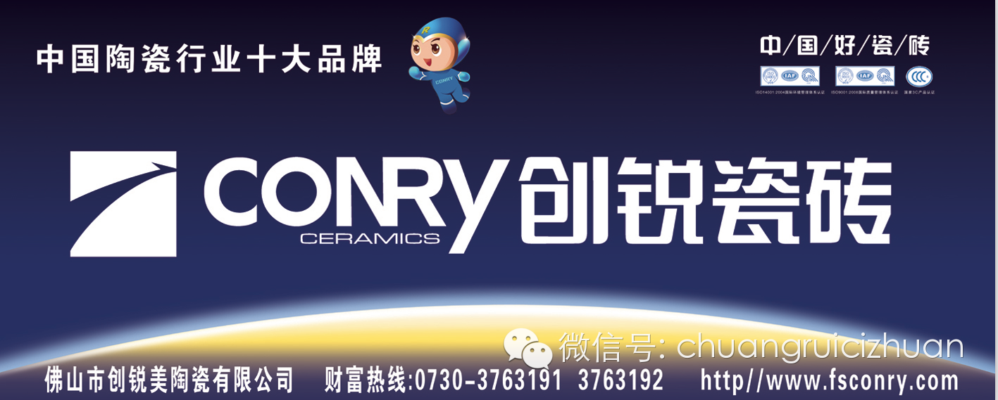 创锐瓷砖是广东佛山顺成陶瓷企业集团旗下主力品牌,公司以生产销售中高档抛光砖,全抛釉、微晶石以及各种规格高级釉面砖为主。企业实力雄厚 ,公司占地数千亩,产能雄踞行业前列,产品品质稳定,拥有发达的水陆交通物流系统。公司采用目前世界上最先进的7200吨压机,高科技辊筒印花机,全自动辊道窑生产线、抛光线,智控5D喷墨打印机等世界上领先的环保型建筑陶瓷生产设备,产品线丰富,配套齐全、花色多样、款式新颖。目前公司已通过国家3C认证,IS09001:2008国际质量管理体系和ISO14001:2004环境管理体系认证,并荣获“中国陶瓷行业十大品牌”称号。